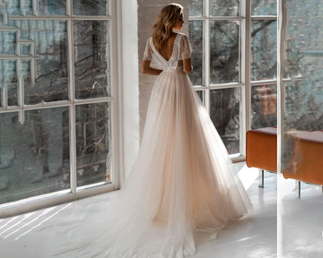 "Short dress in a printed viscose weave with a round neckline, opening with a button at the back of the Seams with small frill trims at the waist and on the sleeves and skirt. Unlined."